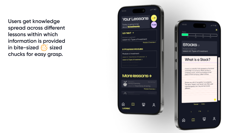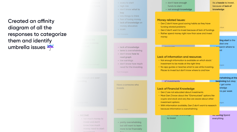 Converging on a particular problem was challenging as during the interview, the interviewees were presenting us with a wide variety of problems in the context of financial knowledge. The problem was streamlined when the data gathered was arranged in a affinity map under a boarder umbrella problems. This allowed us to explore various umbrella problems that our solution could incorporate.
